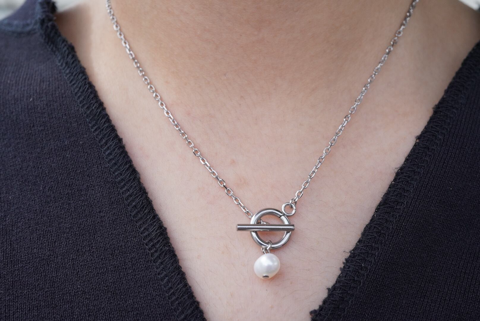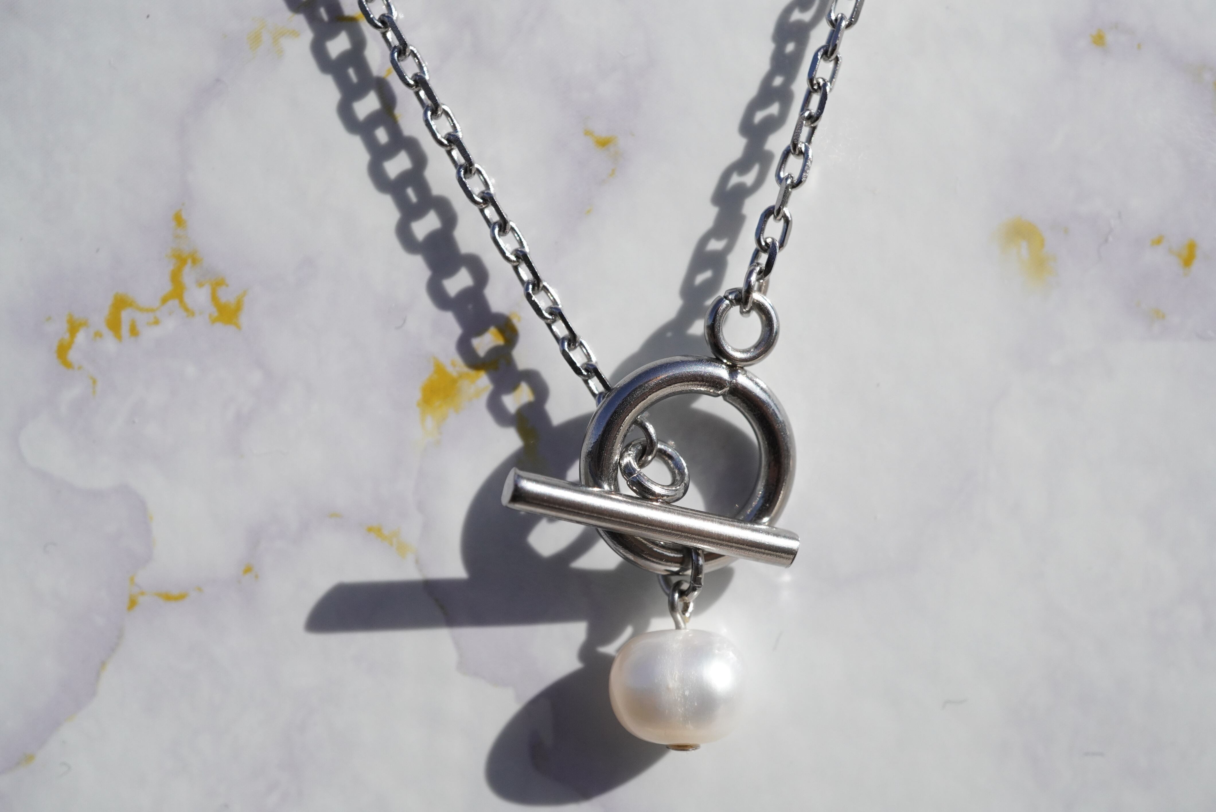 小豆チェーンとマンテル、さらに一粒の淡水パールを使用したネックレスになります。